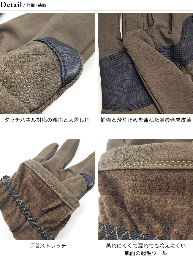 起毛されたウールが暖かく手を包み込み、アップダウンの連続で手が汗ばんだとしても、ウールの調湿性と優れた透湿性によってオーバーヒートしにくく、汗の濡れによる冷えを軽減します。