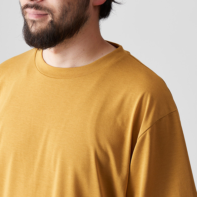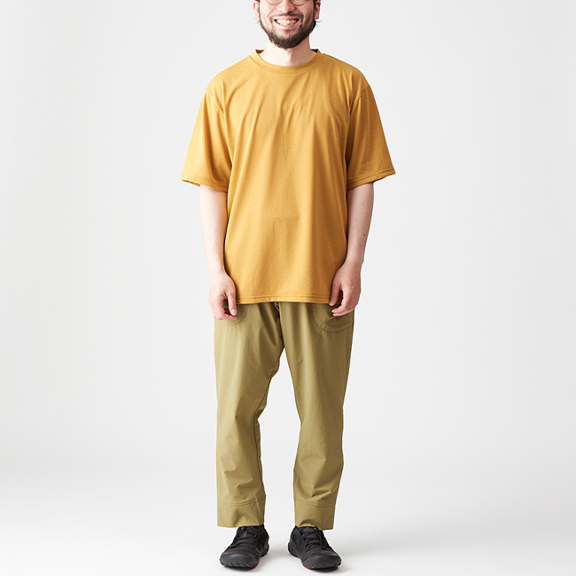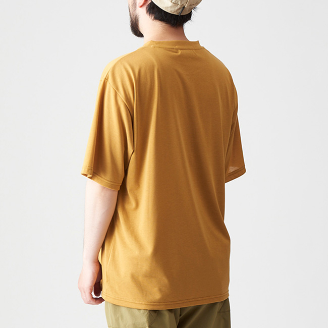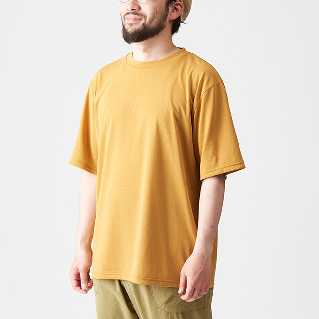 峠を越えて尾根の途中にある山小屋のテラスに着いたらシャツを脱いで涼んでみたくなりますね。そんなとき、吸汗速乾性に優れる旭化成のSUREDRYを採用したショートスリーブのTシャツなら汗を効果的に乾かしてくれます。