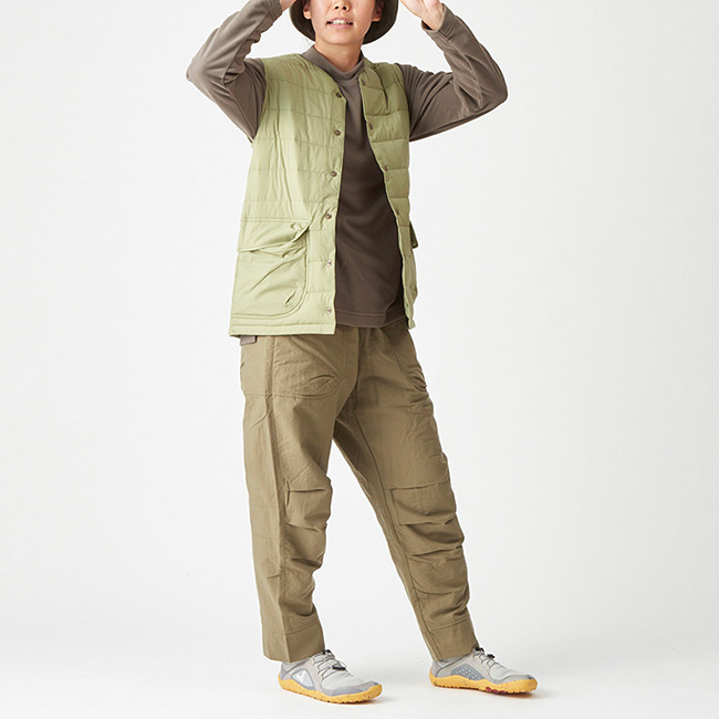 ポケットはAXESQUIN ELEMENTSのパンツでおなじみのデザインをベースに、使い勝手を考えて前側を広くしてフラップを付けています。やや細身でシンプルなデザインはコーディネートの邪魔をせず、下山後の移動時には普段着のように自然に着ることができます。