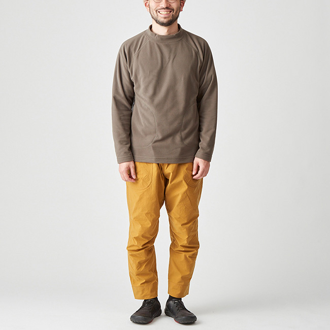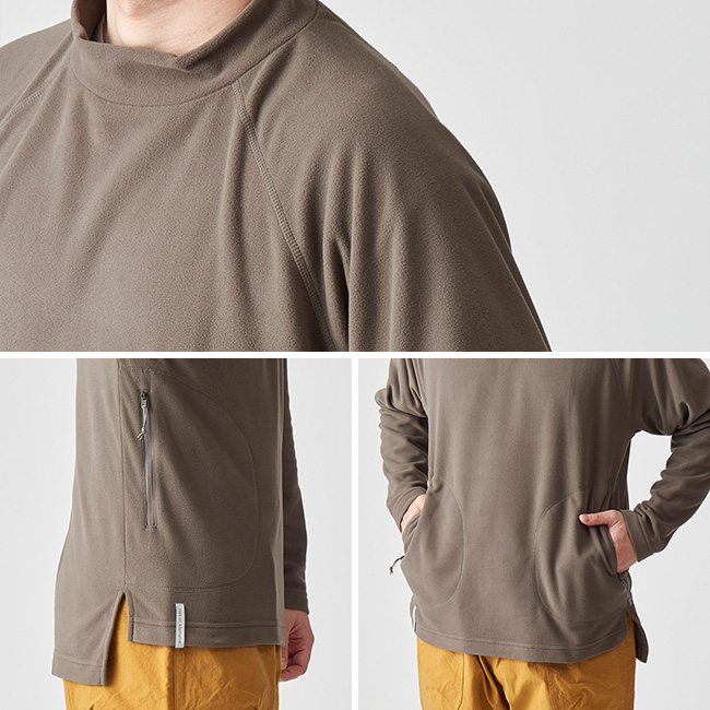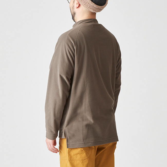 紅葉に包まれた静かなクラシックルートをのんびり歩くのに最適な、リラックスフィットのフリースセーターです。薄手でありながら目の詰まったベルベット調のフリースが軽くてちょうどいいあたたかさを、ゆとりのあるモックネックと肩まわりをすっきりさせたラグランスリーブのデザインがリラックスした着心地を提供します。