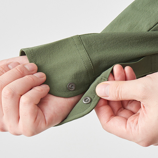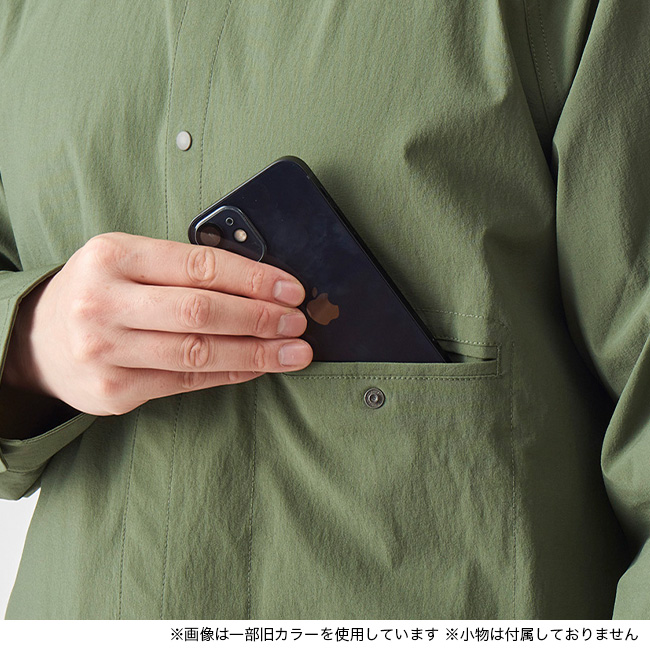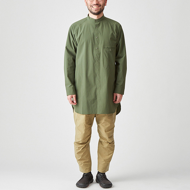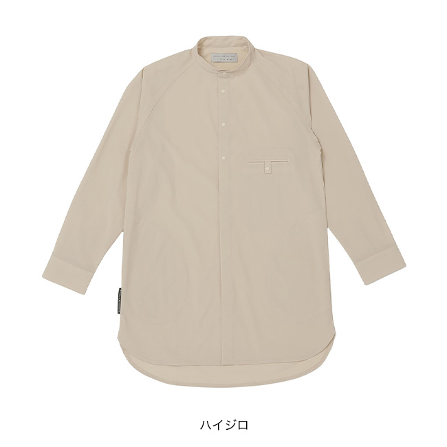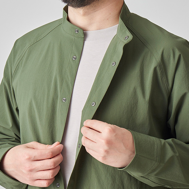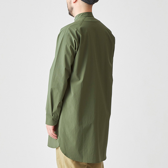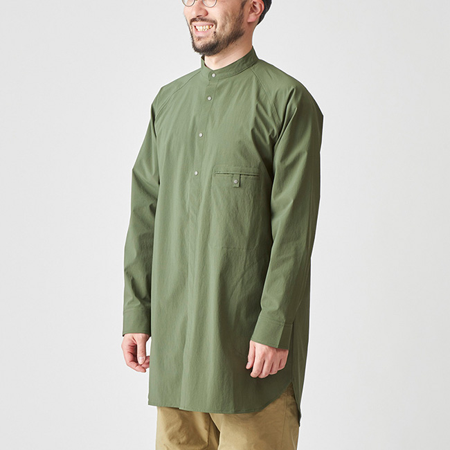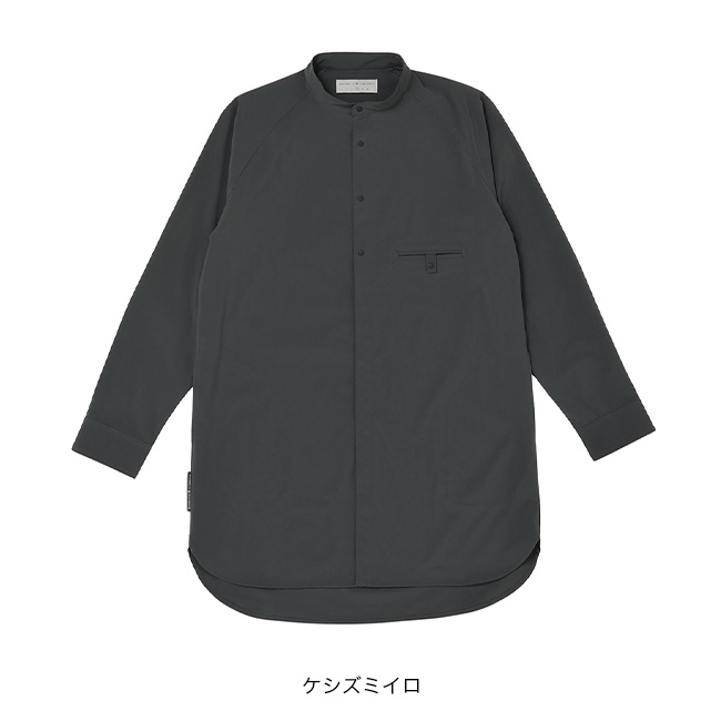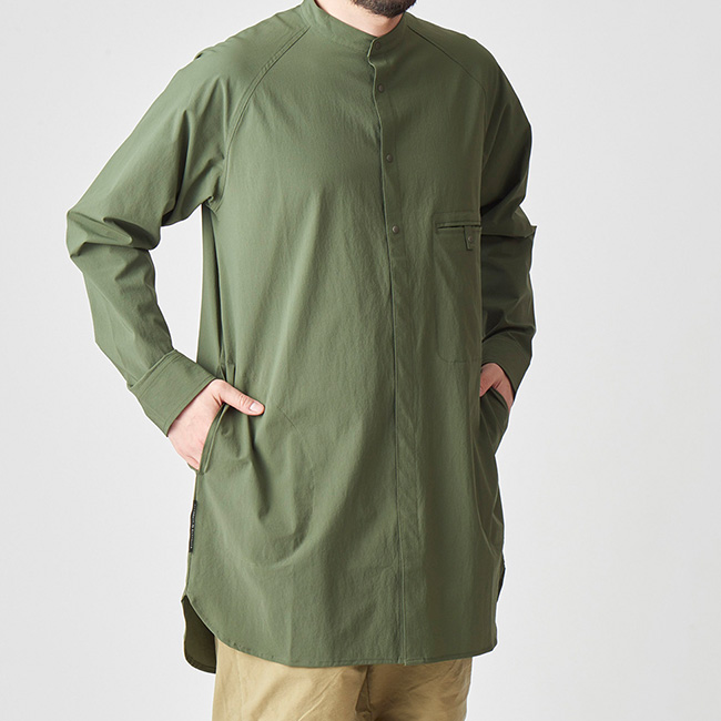 バンドカラーで衿周りをすっきりさせた、薄すぎず厚すぎない、秋冬シーズンにちょうどいい厚みのソフトシェルのロングシャツです。膝上までカバーする長い着丈によって冷たい風を和らげて保温するエリアが広がり、高い通気性が汗の蒸れを軽減します。