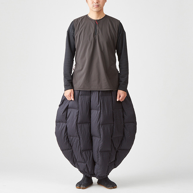 ダウンのふくらみによって見た目よりも軽い着心地を実感できます。アグラスカートを穿いてしばらくすると体温によってスカートの中の空気が温められます。この温められた空気が独特の樽型のシェイプのおかげで外に漏れ出すことなくスカートの中に閉じ込められるので想像以上のあたたかさを提供します。ベストとして着ると身頃から腰回りまでがすっぽり覆われるので体全体が温まります。