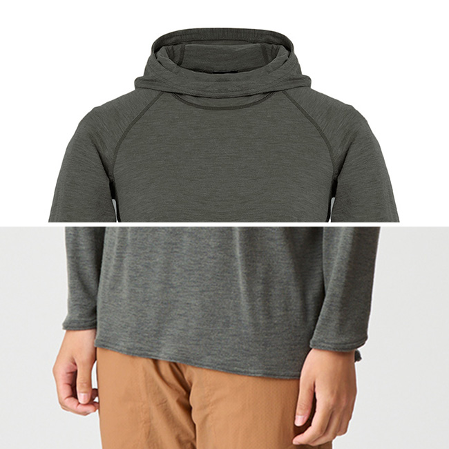 ふんわり優しい肌触りが特長の革新的なウール素材NUYARNを採用したロングスリーブフーディーです。素材の良さを引き出すために敢えてシンプルなデザインを採用し、レイヤードの際の肩まわりのごろつきをなくすためにラグランスリーブで仕上げています。