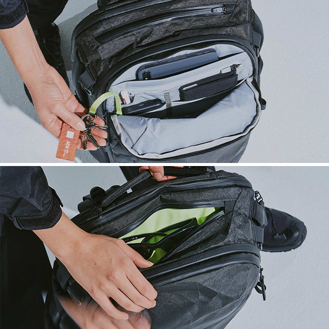 フロントポケットやトップポケットはクイックアクセス設計で、スマートフォンや小物などをすぐに取り出すことが可能です。