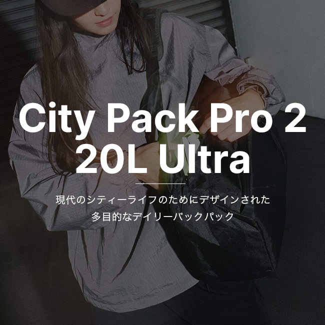 City Pack Pro 2 ultra 20Lはシティーライフの日々のためにデザインされたバーサタイルなバックパックです。広々としたフラットに開くメインコンパートメントが特徴で、日々使用する必需品を収納できる内装と一日中背負っても快適な人間工学に基づいたハーネスシステムを備えています。