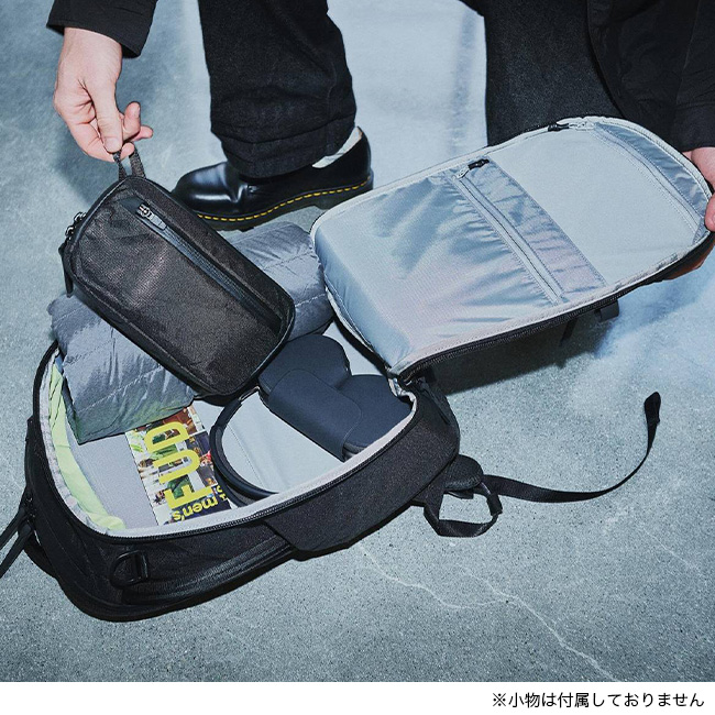 メインコンパートメントは大きく開くワイドアクセス設計で、中身が見やすくスムーズなパッキングが可能。