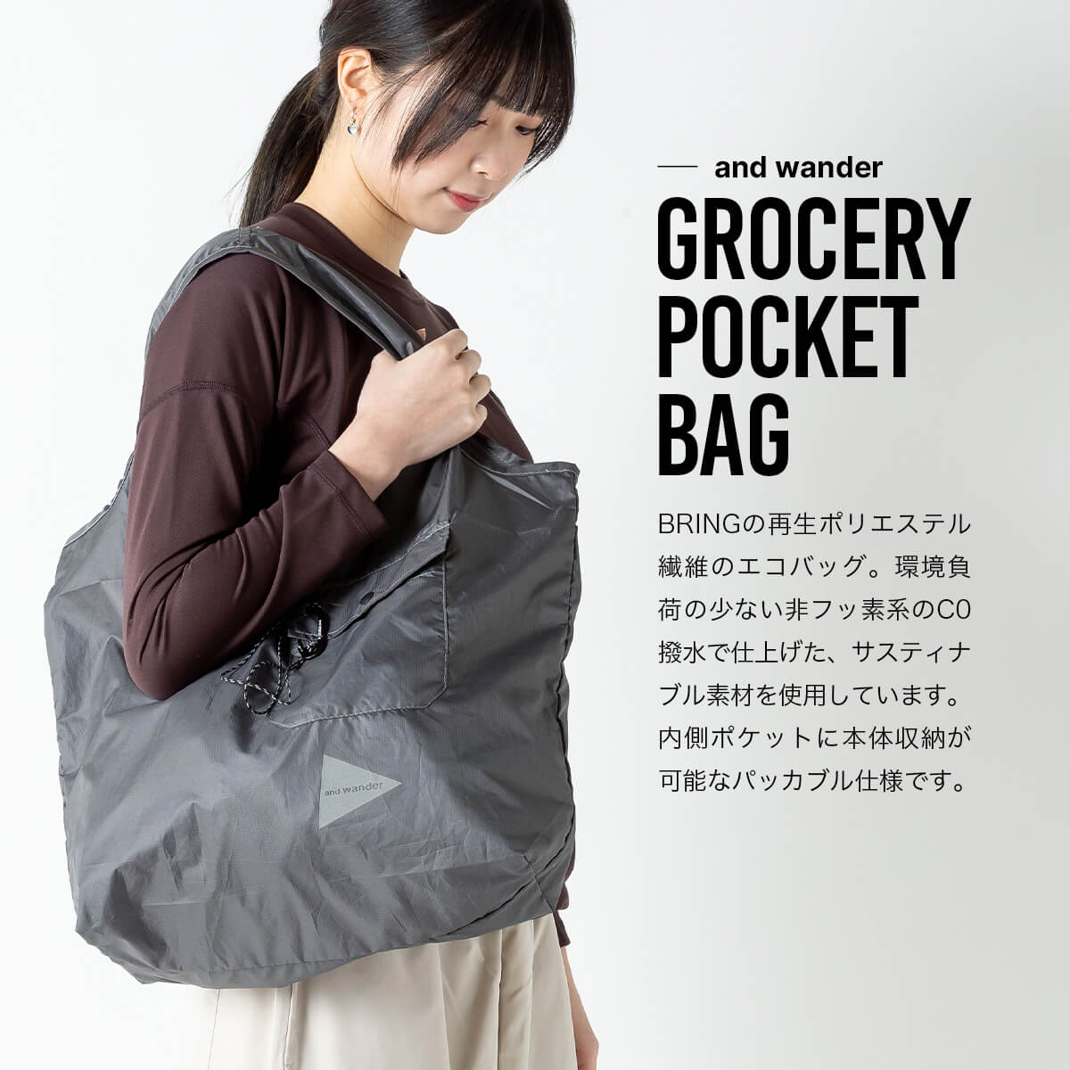 アンドワンダー グロサリーポケットバッグ and wander grocery pocket bag 5745985234 エコバッグ サブバッグ トート パッカブル 軽量 レジ袋 フェス おしゃれ キャンプ アウトドア
