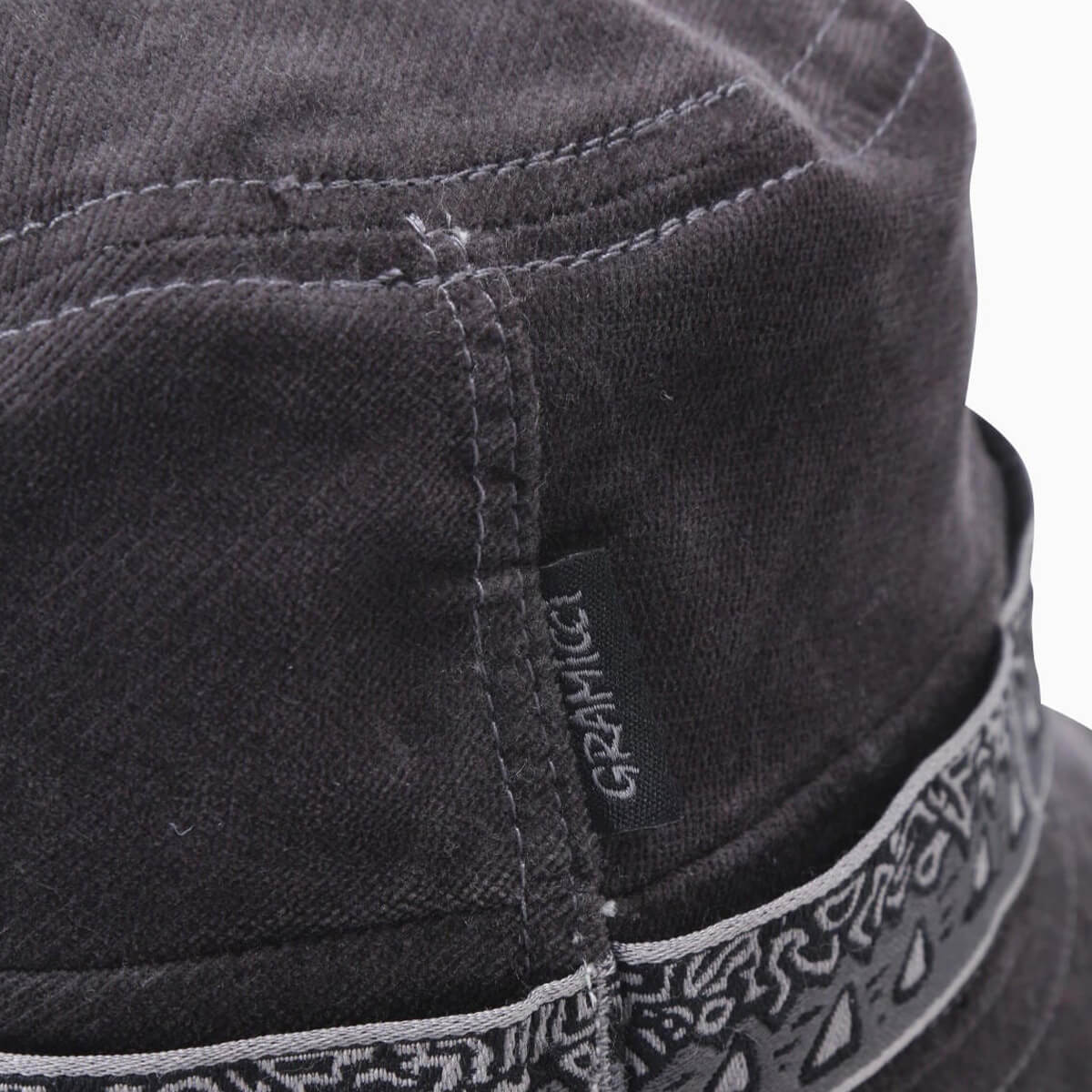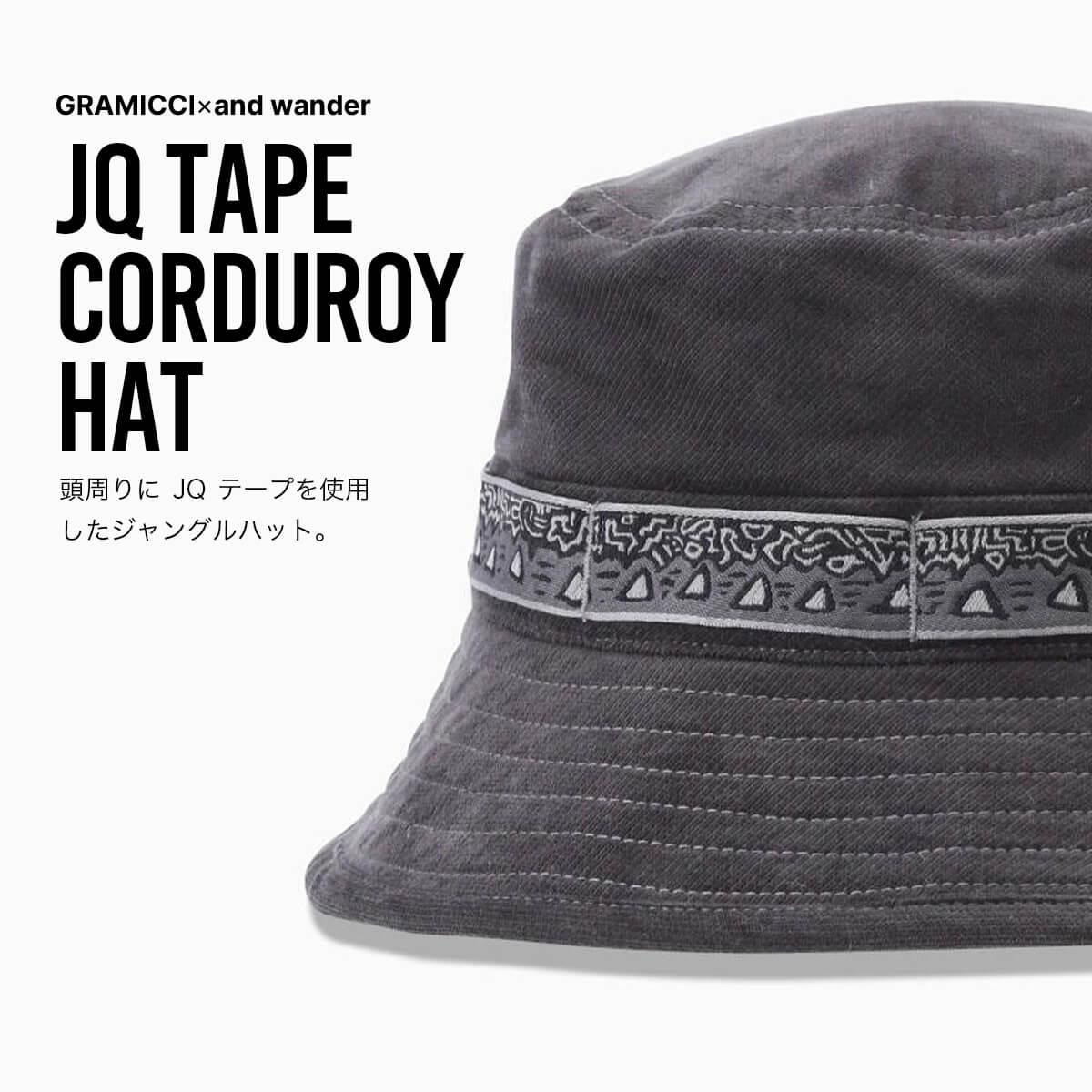 頭周りにGramicciとand wander コラボレーションのために作られた、JQテープを使用したジャングルハットです。軽量なコーデュロイ素材は、裏面に吸水スパン糸を使用することで吸水速乾性があります。