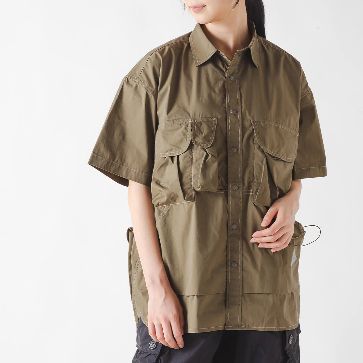 吸水速乾性とストレッチ性を持つタイプライター生地を採用した、多機能ポケットが特徴のシャツです。大小合わせて5つのフラップポケットと、ウエスト部両側にはスラッシュポケットを配置。