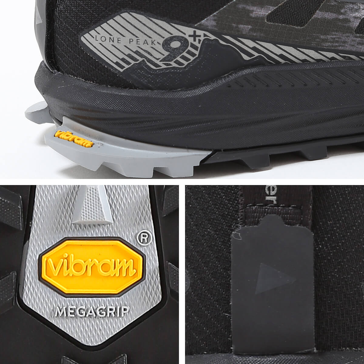 LONE PEAK 9+は、VIBRAM MEGAGRIPが採用され、特に濡れた路面や起伏のある地形で高いグリップ力を発揮します。