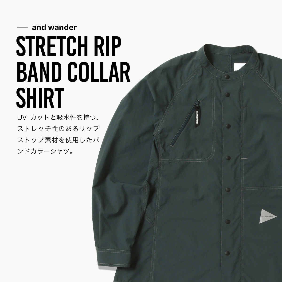 アンドワンダー ストレッチリップバンドカラーシャツ and wander stretch rip band collar shirt 5746953021 メンズ 長袖 ロングスリーブ カジュアルシャツ UVカット 吸水性 トップス おしゃれ キャンプ アウトドア