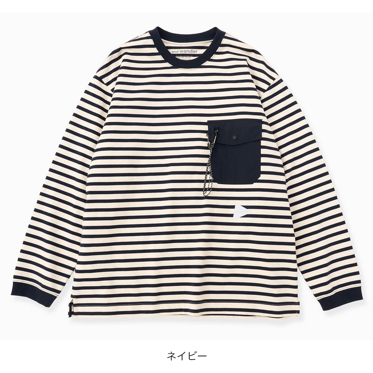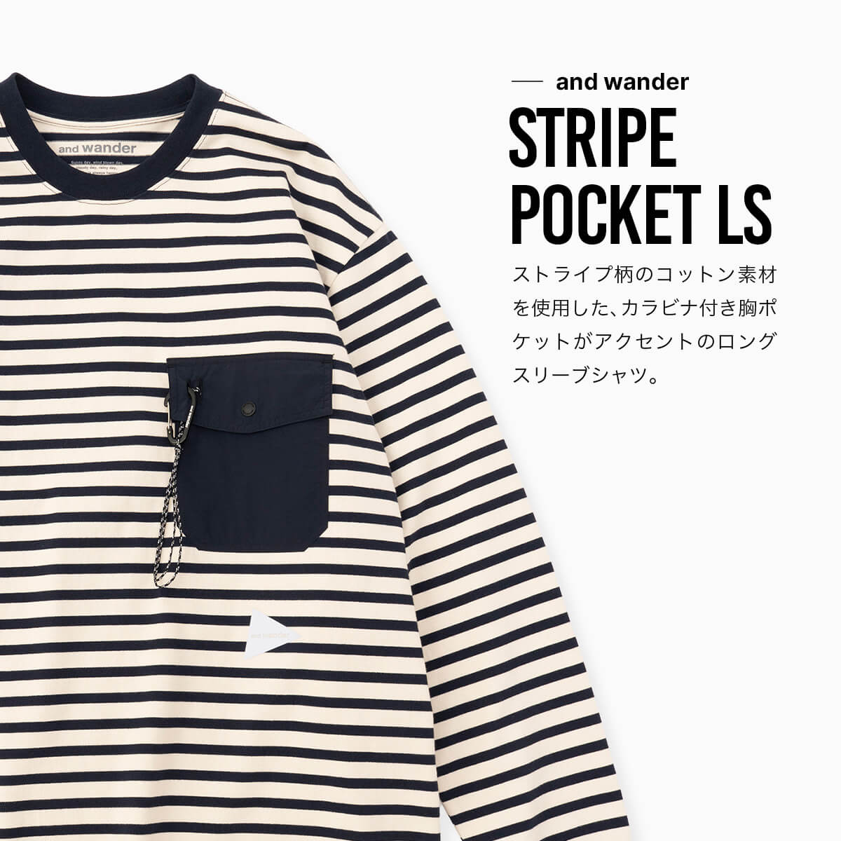 ボーダー柄のコットン素材を使用した、ロングスリーブシャツです。and wanderのブランドアイコンとも言える、カラビナ付き胸ポケットがアクセントになっています。