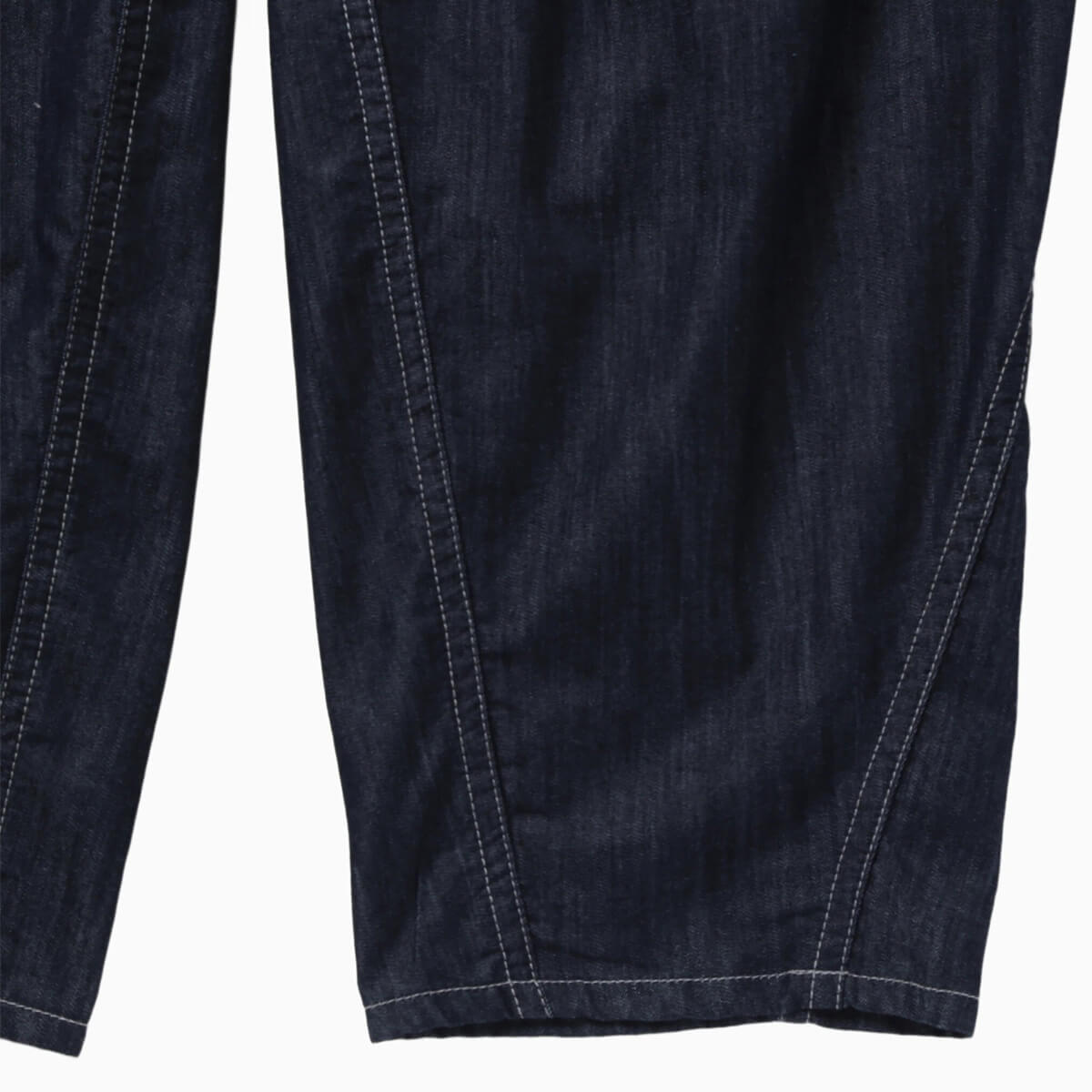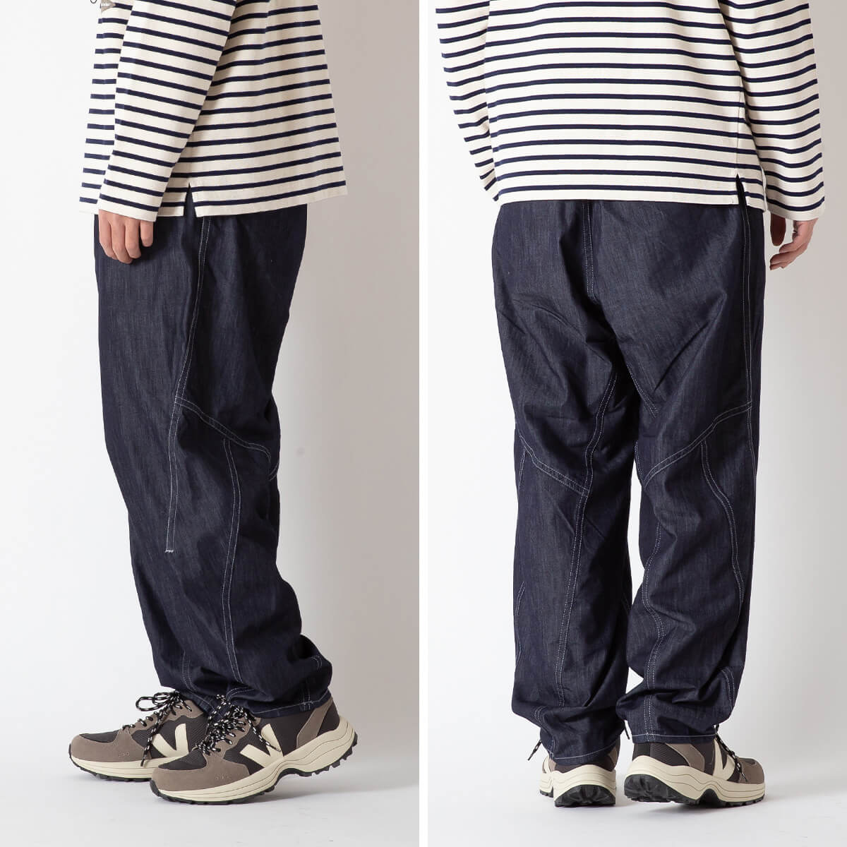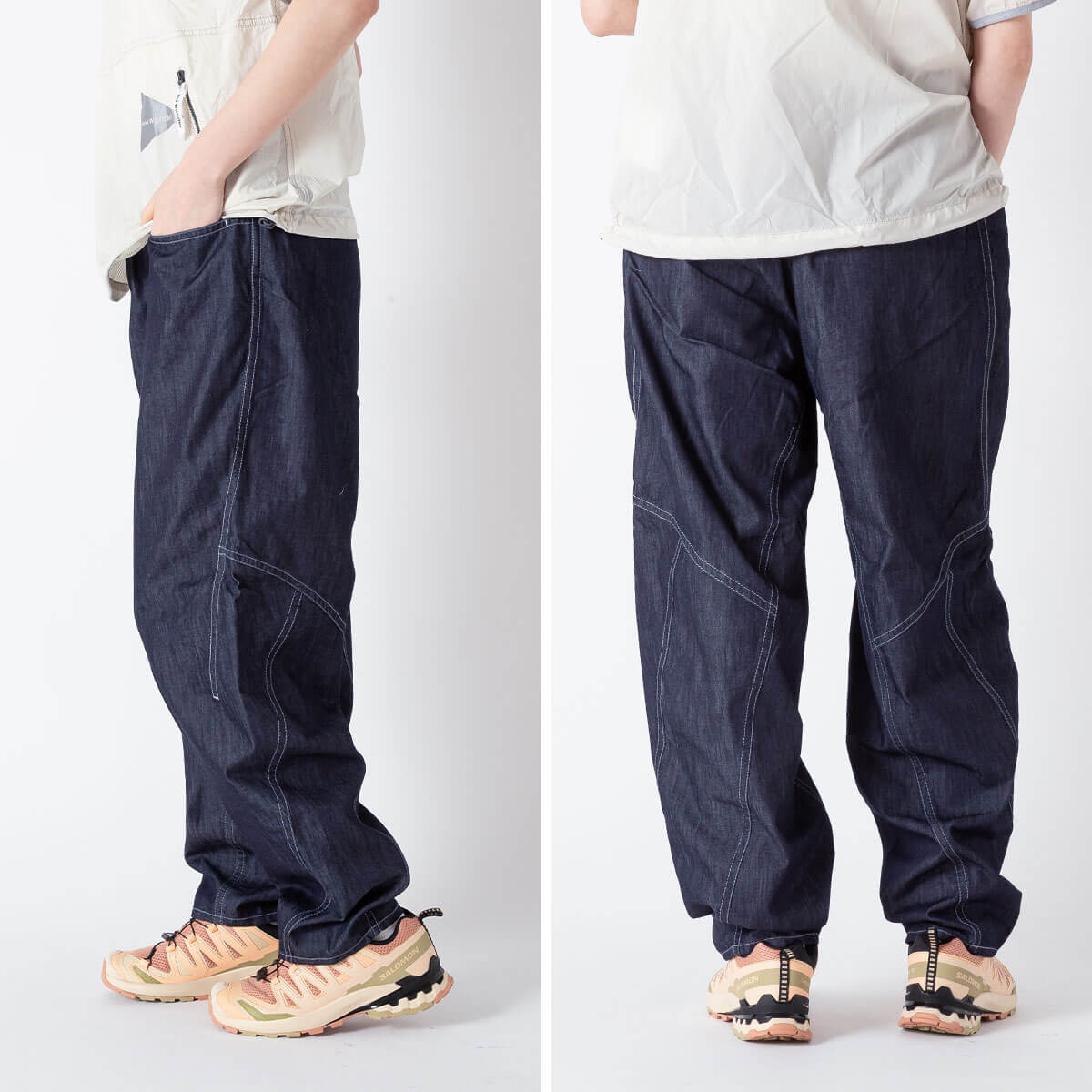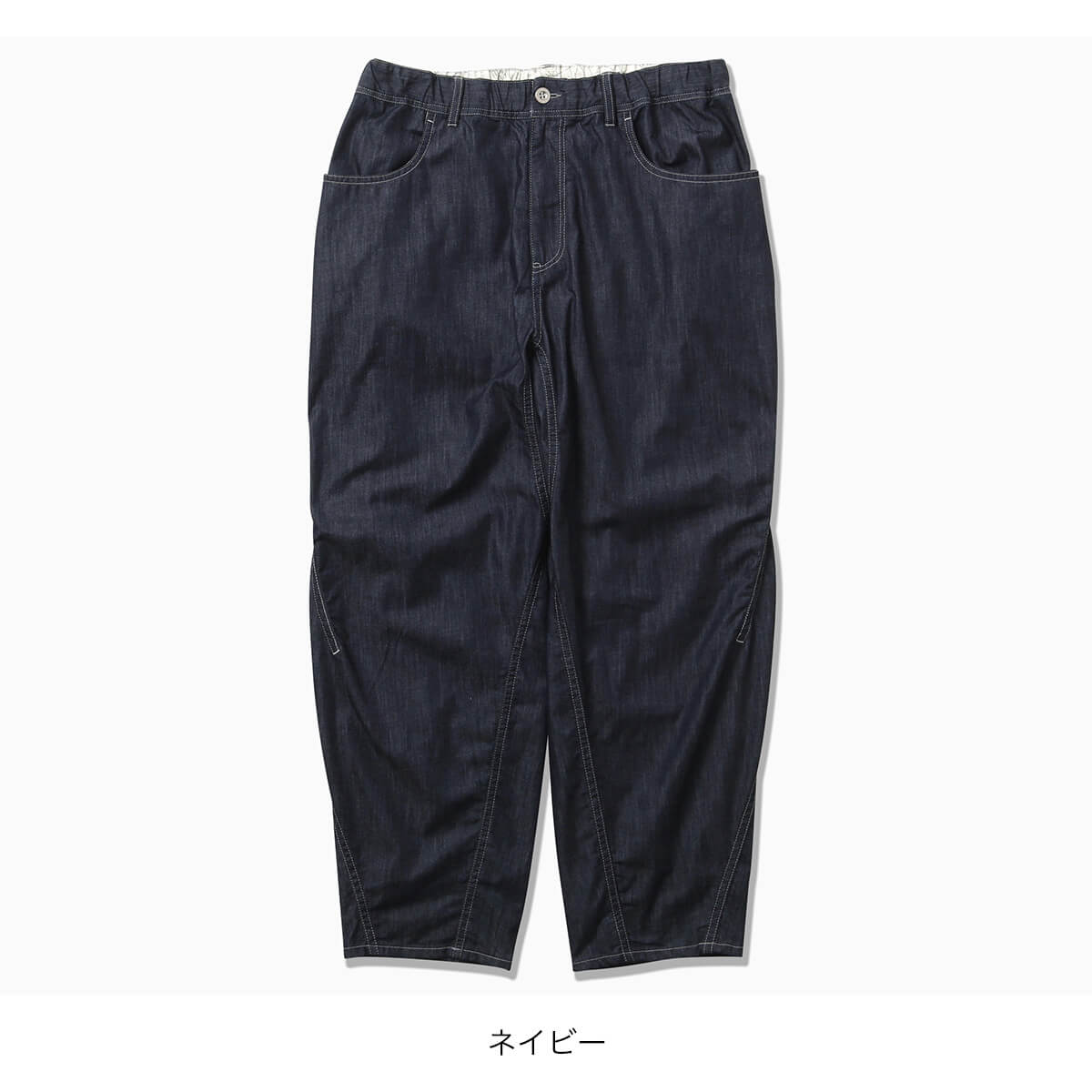 COOLMAXの糸を使用した吸水速乾性のあるオリジナルストレッチデニムのワイドパンツです。部分的にリフレクターステッチを施しており、夜間の視認性をあげています。