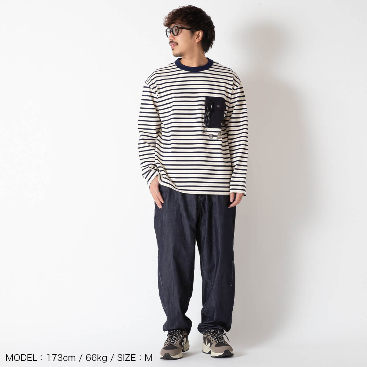 機能性とデザイン性を兼ね備えた、ワイドシルエットのデニムパンツ。