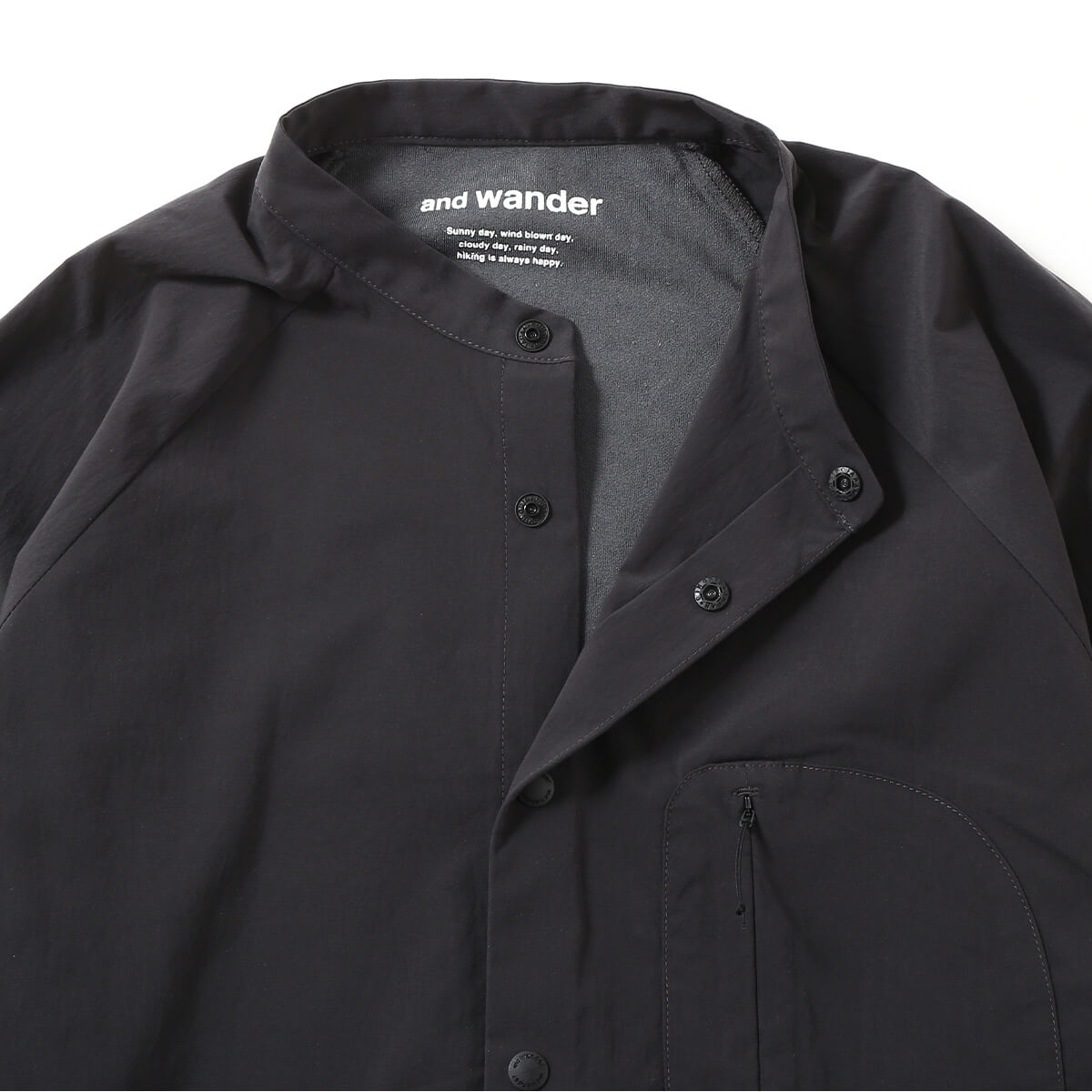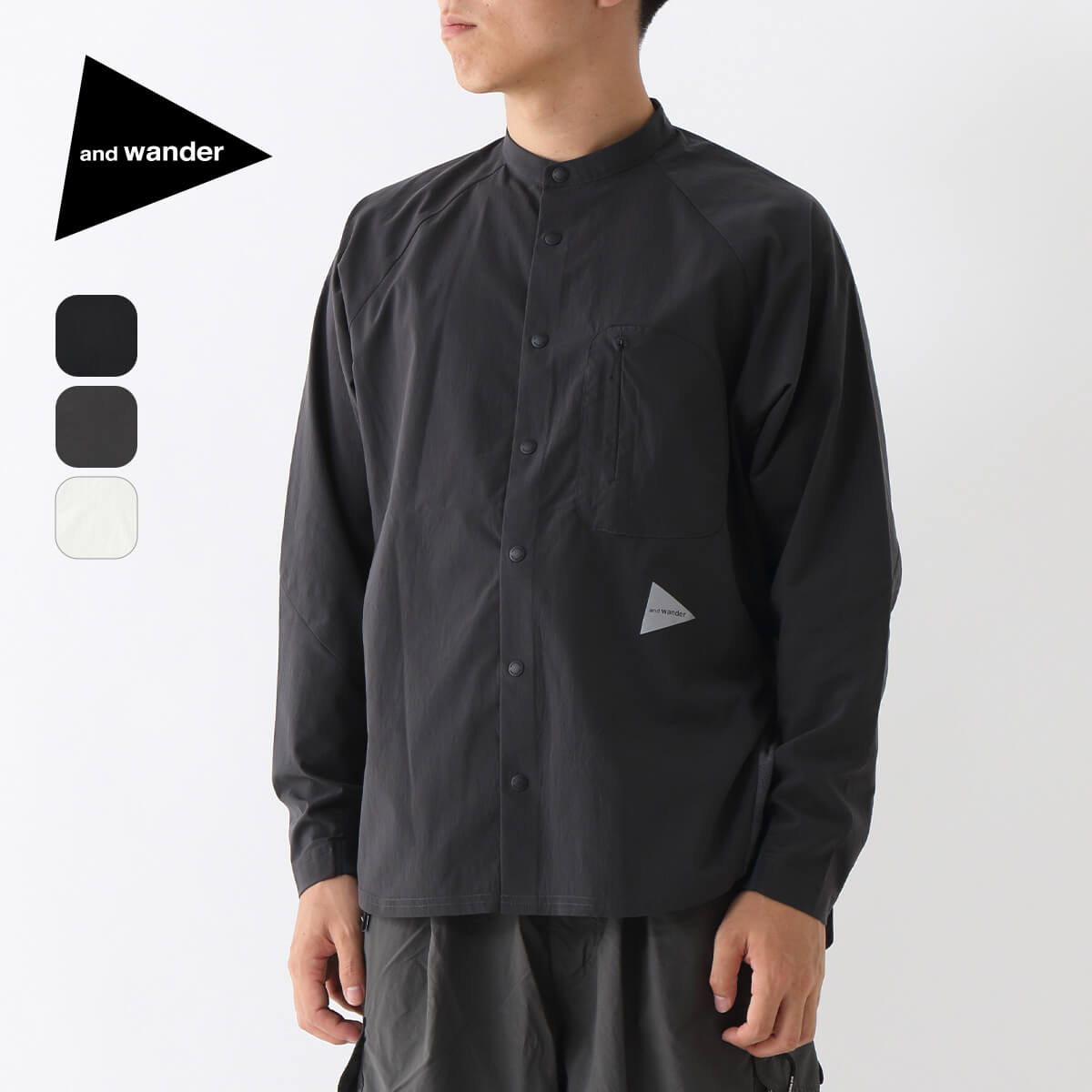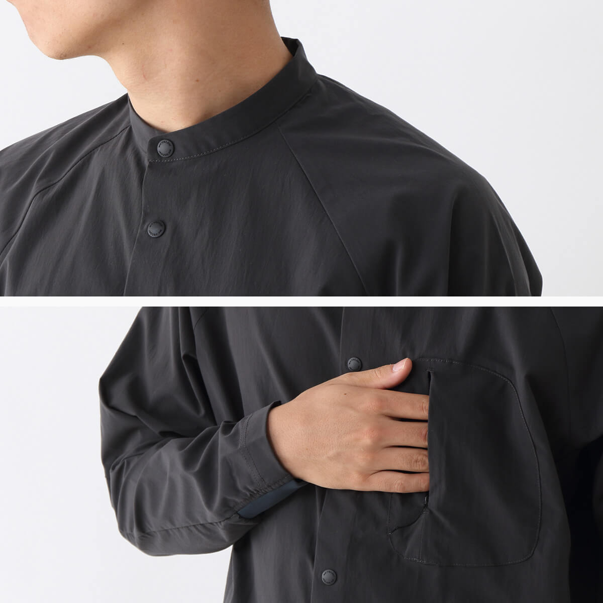 保温効果の高いサーモライトファブリック素材のバンドカラーシャツ。