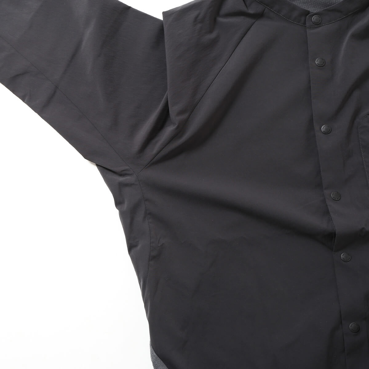 インビスタ社のサーモライトファブリックを使用したバンドカラーシャツ。柔らかな風合いの薄手フリースと、部分的にストレッチ素材を使用した着心地と肌触りの良さが特徴です。