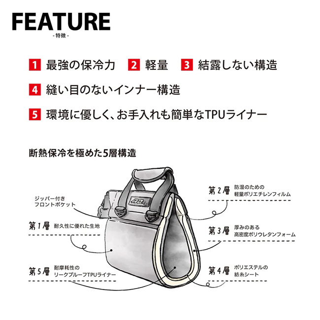 保冷効果を最大限に発揮する独自5層構造の組み合わせによりサイズによっては氷なら49℃の中で24時間維持することができます。