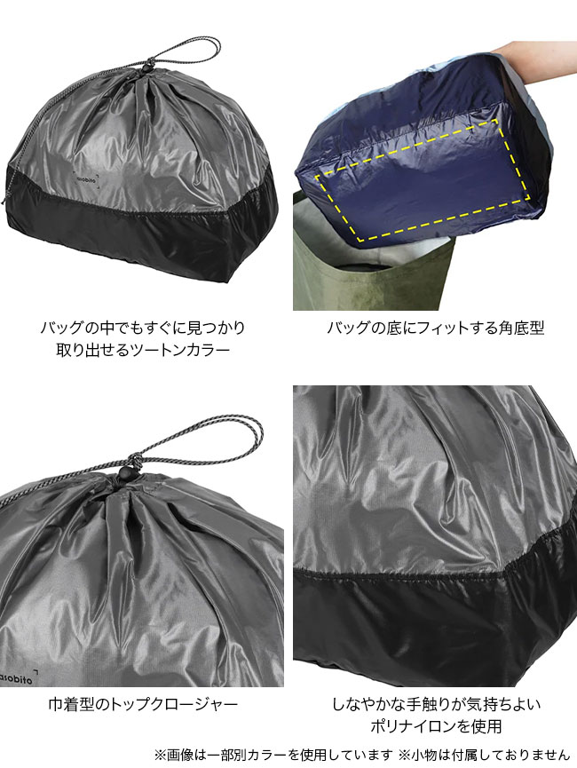 バッグの底にフィットする角底型。L(10L)サイズは寝袋、シェルジャケット、2泊以上の衣服など用途に応じてまとめて収納したい道具をしまうのに使いやすいサイズです。