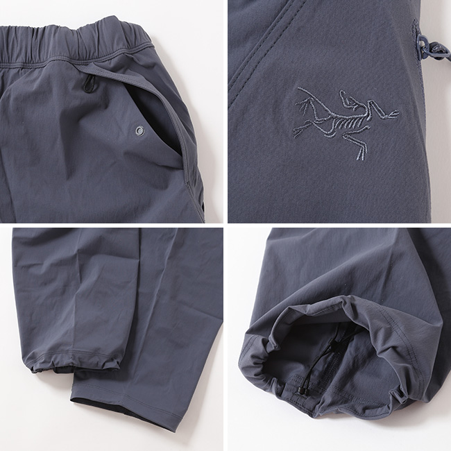ハーネス装着時でも邪魔にならない薄型ウエストアジャスターや通気性を高める前後のベンチレーションポケット、ジッパー付き太ももポケットなど、クライミングをはじめとするアクティビティでの機能性を追求した仕様が特徴です。