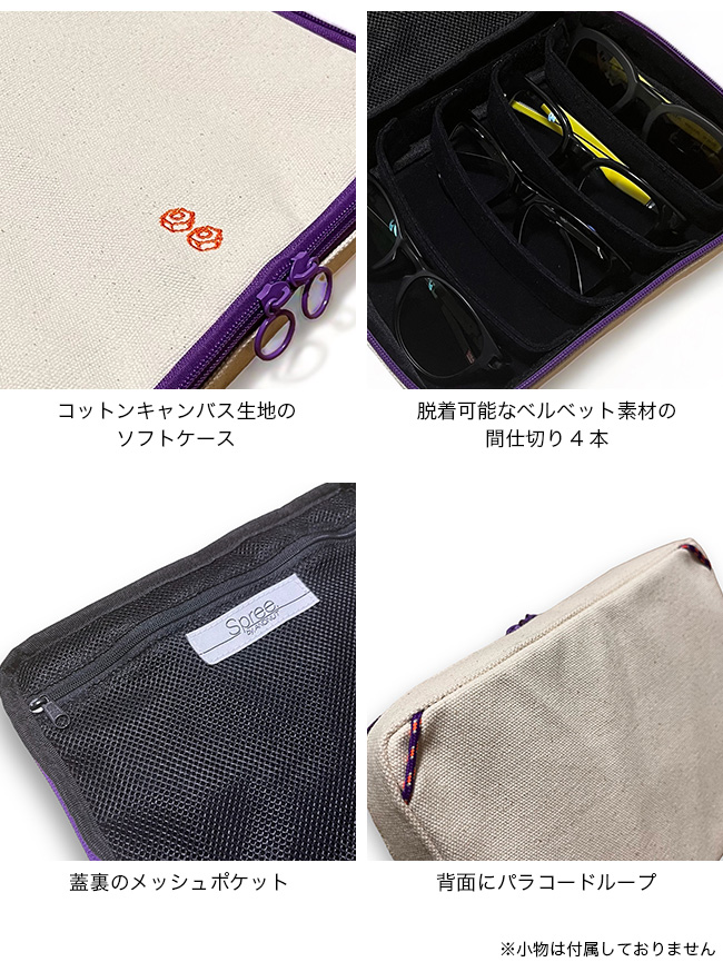 眼鏡とサングラス、たくさんお持ちの愛好家さんに朗報です。コットンキャンバス生地のソフトケースで、内側は総ベロア生地仕様になっており、また側面部分のぐるり一周と、マジックテープで可動できる間仕切り部分にプラスチック板が入ってますので、しっかり眼鏡やサングラスを保護してくれます。