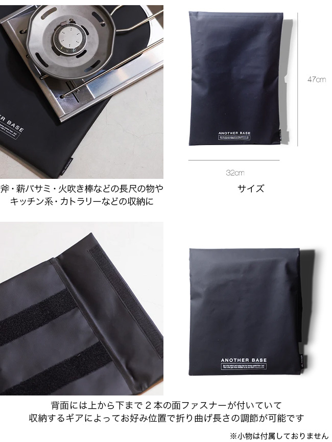 焚き火周りの「斧・薪バサミ・火吹き棒」などの長尺の物やコンパクトな薪割り台・焚き火台なども収納可能。