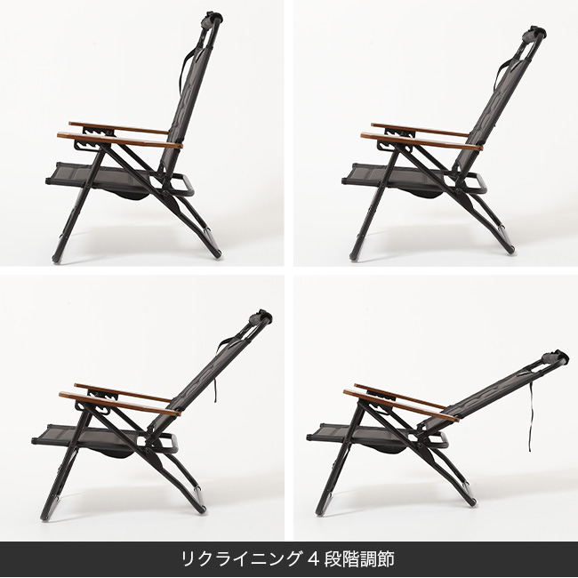 リクライニング4段階調節により、完全に地面とフラットにして寝転べるように設計されています。