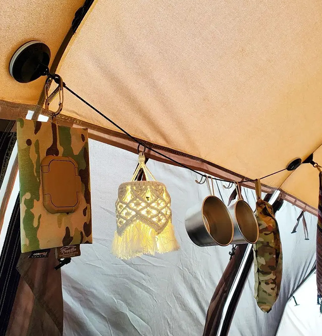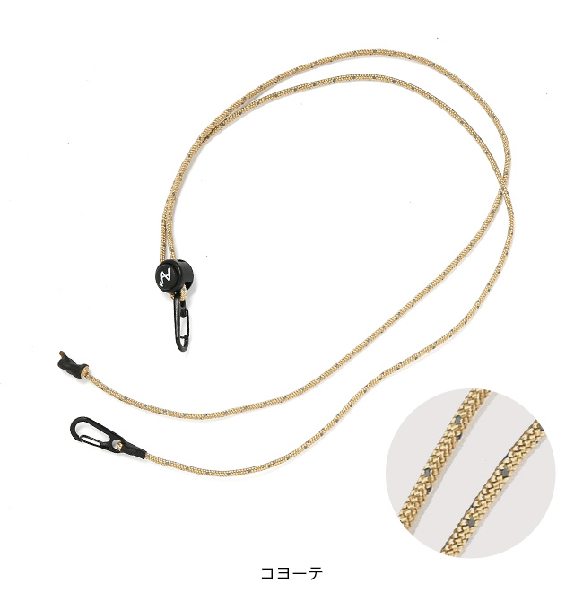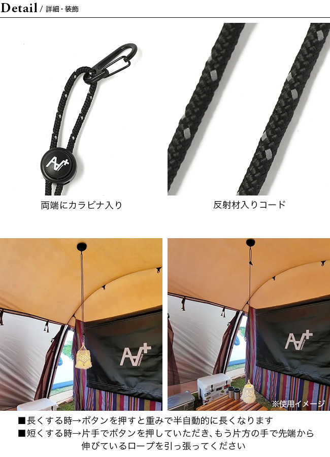 413kgの耐荷重がある反射材入りコードの両端にカラビナがついており、ロゴのボタンを押していただくことで、簡単に低くも高くもしていただけます。