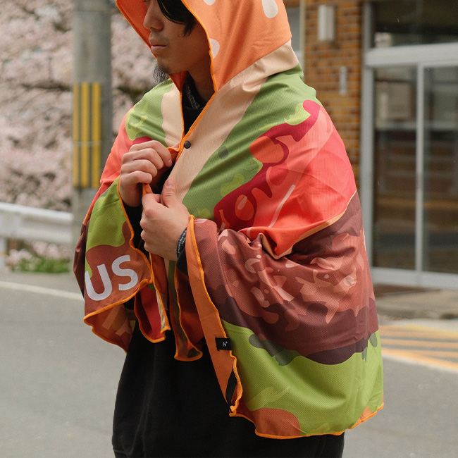 身体をゆったり覆えるサイズ感で、頭や首元はもちろん、肩まわりまでしっかりカバー。