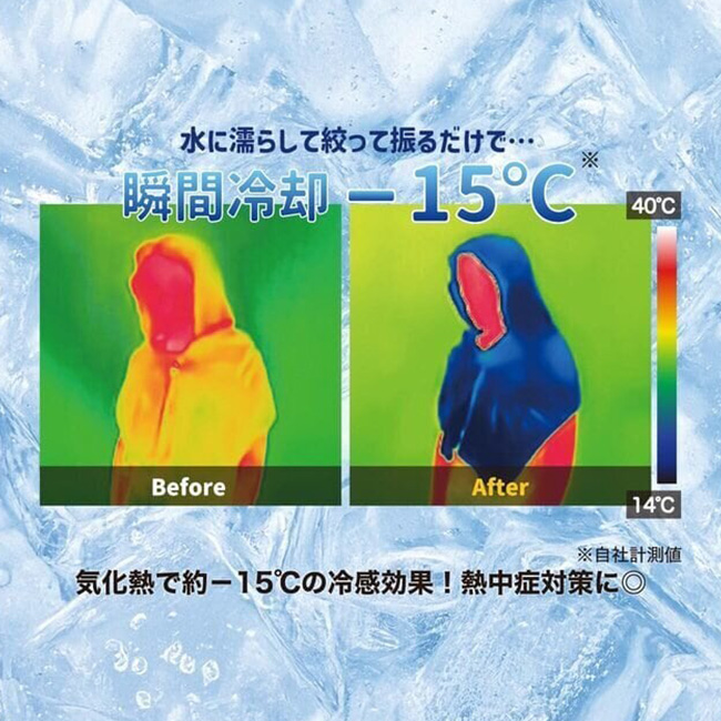 気化熱の作用により、ひんやりとした冷感が得られるクーリング機能を備えた、ポンチョのように被れる速乾タオルです。