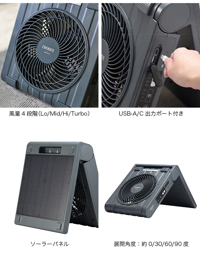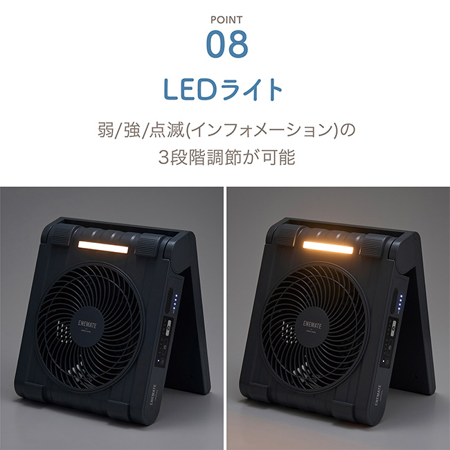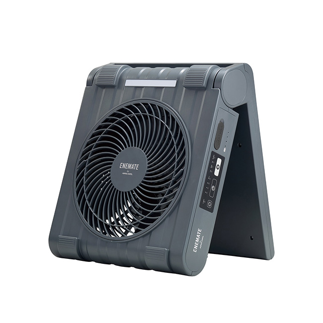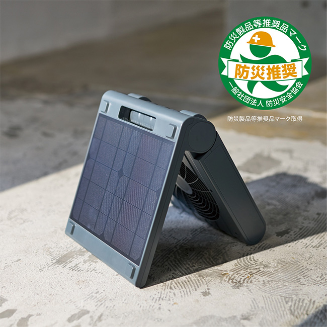 ソーラーパワーファンは、背面に搭載したソーラーパネルでみずから発電し運転します。ご好評をいただいた従来品にLEDライトが追加され、外観もタフネスなデザインへリニューアルしました。