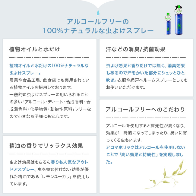 アロマホリックはアルコールを使用しないことで「高い効果と持続性」を実現しました。