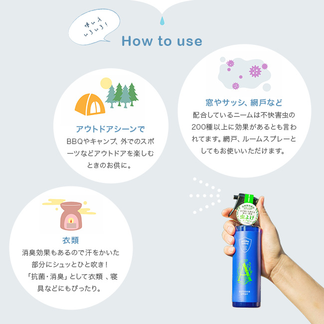 アウトドアスプレーとしてお使い頂けることはもちろん、衣類以外でも部屋の窓やサッシ、網戸など虫を寄せ付けたくない場所で、安心してご使用いただけます。