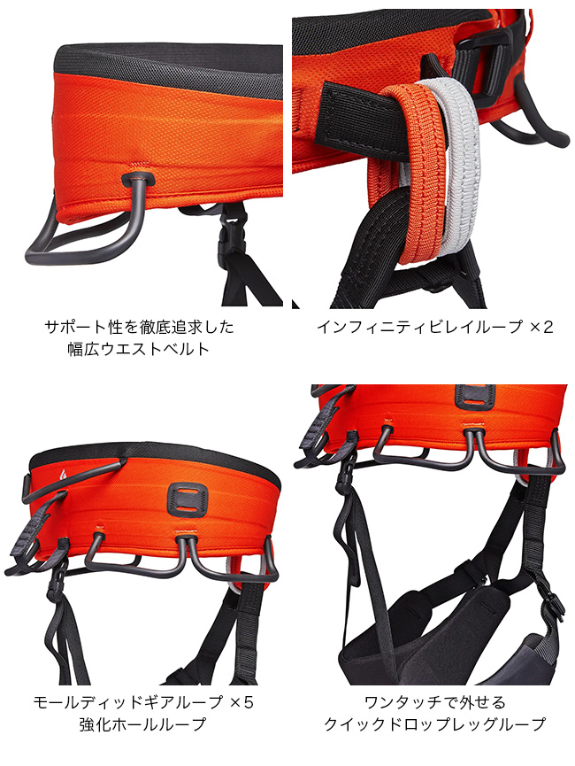 エイドクライミングに特化したモデルで、軽量素材をベースに十分なパッドを備え、壁に取り付いている時間が長い状況でも快適なフィット感を提供します。装備の整理と携行を考えた設計も特長で、成形された5つのギアループを搭載。