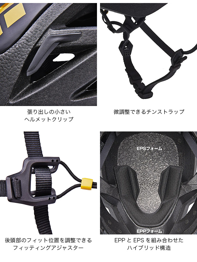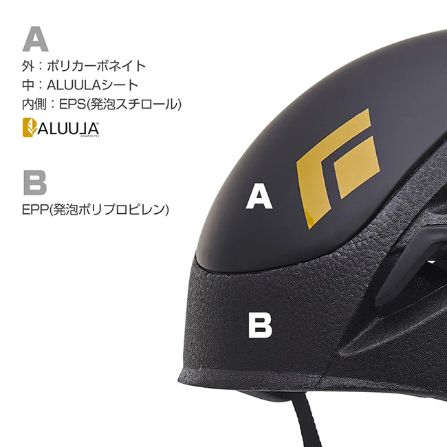 フォーム材を従来のEPSから、軽量かつ弾性に優れたEPPへ変更。さらに、衝撃を受けやすい頭頂部にはポリカーボネートとEPSを組み合わせ、補強素材ALUULAをサンドイッチしたハイブリッド構造を採用しました。