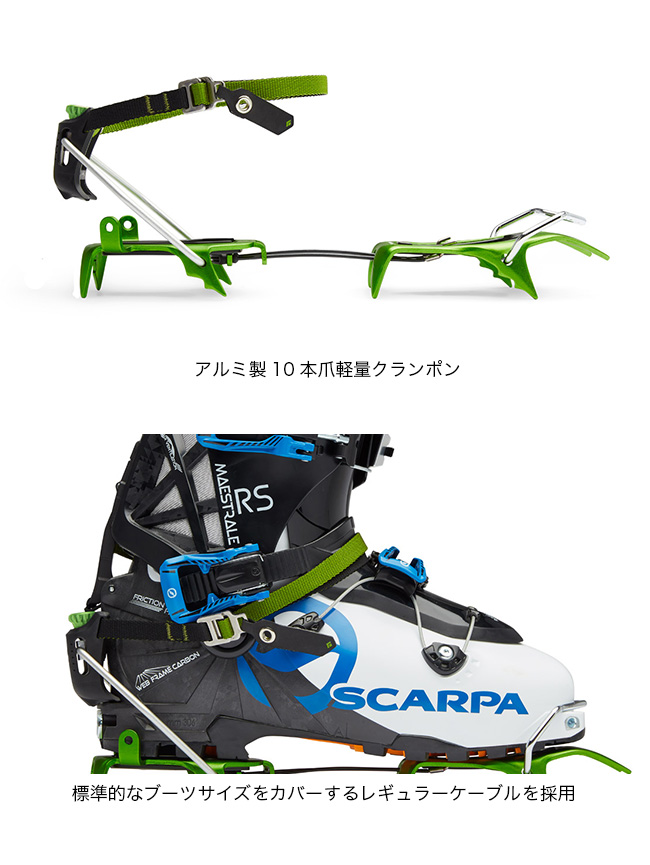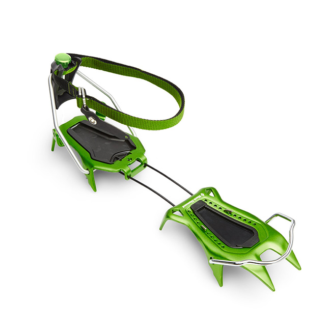 スキー登山やアルパインルートのアプローチ等で活躍するアルミ製10本爪クランポン。