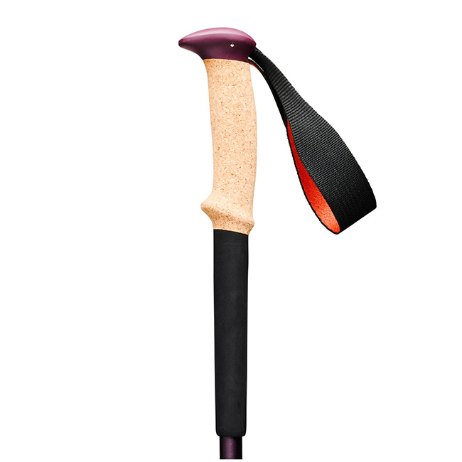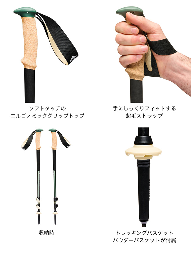 100%天然コルクから削り出したグリップは吸汗性やフィット感など快適な握り心地を提供します。スノーシューイングなど雪上でポールが潜らないパウダーバスケットが付属。