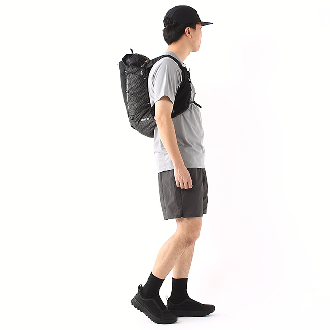ソフトフラスクポケットは高い位置にあり、走行中にショルダーベルトが跳ね上がるのを軽減します。