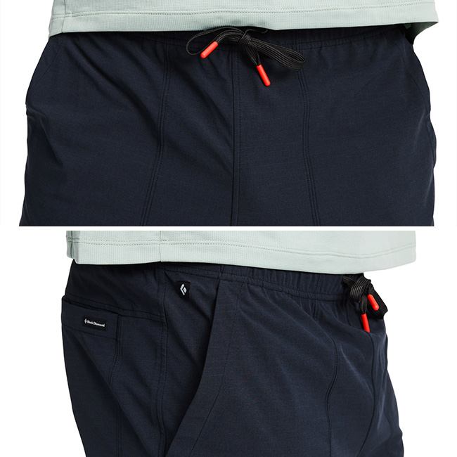 ウェストはゴム入りでドローコードを備え、ハーネスをすっきりと装着できます。