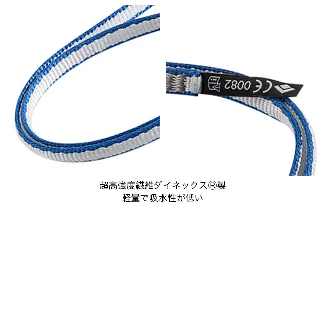 アンカーの構築や岩角・樹木へのスリング、ロープの流れをスムーズにする延長用途まで幅広く対応。高い耐摩耗性と軽量性を兼ね備えたDynex素材を採用し、装備の重量を抑えながら優れた耐久性を発揮します。