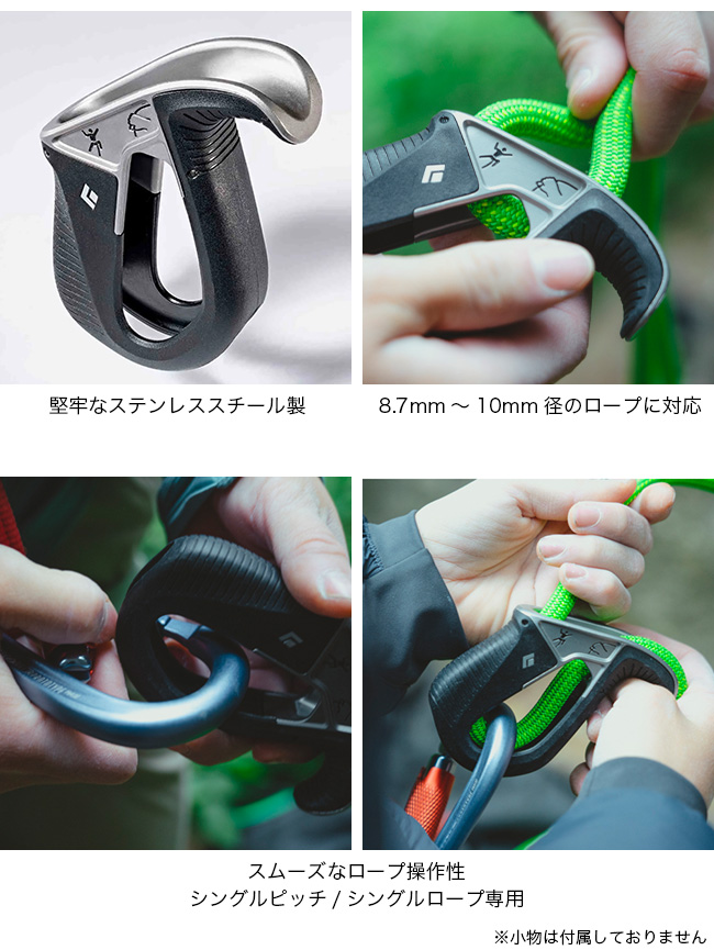 8.7~10.5mm径のシングルロープに対応し、幅広いクライミングシーンで使用できます。