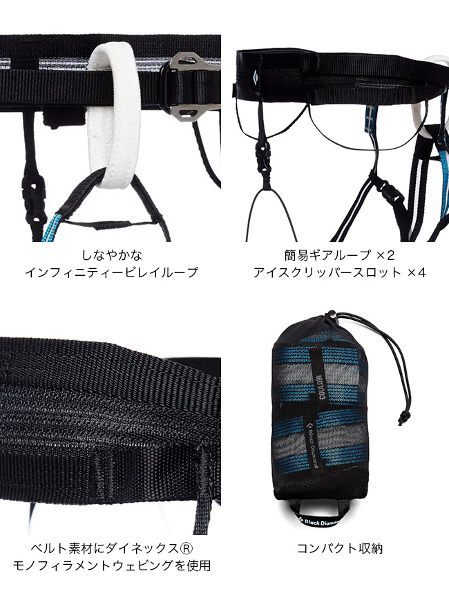 スキー登山やアルパインルート、氷河歩行などのテクニカルな環境に対応する超軽量ハーネスです