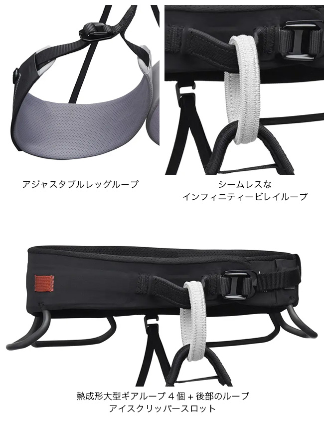 シームレスなインフィニティービレイループを採用、ビレイ/ラペル時にバータックの段差で生じる引っ掛かりを解消しています。