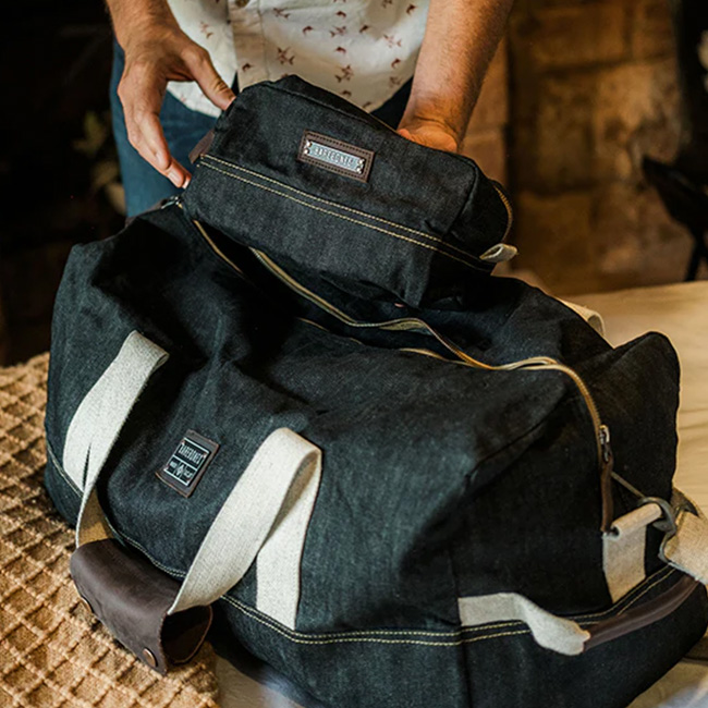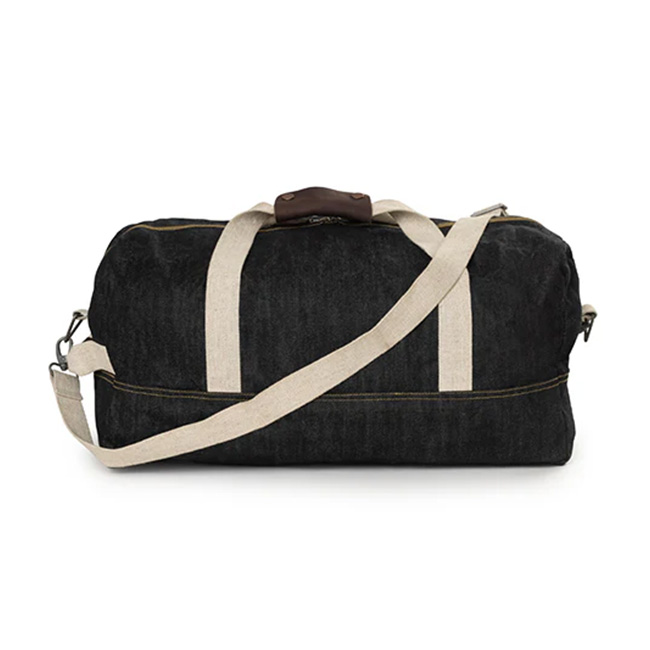 デニム生地で作られた、シンプルで頑丈なトラベルダッフルバッグです。