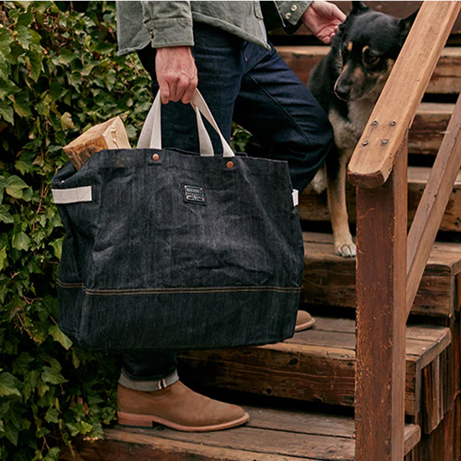 耐久性に優れた、深みのある豊かなブルーのワックスコーティングを施した丈夫なデニム生地。ログキャリア、カーキャンプの荷物持ち、大量の食料品入れなど、様々な用途でお使いいただけます。
