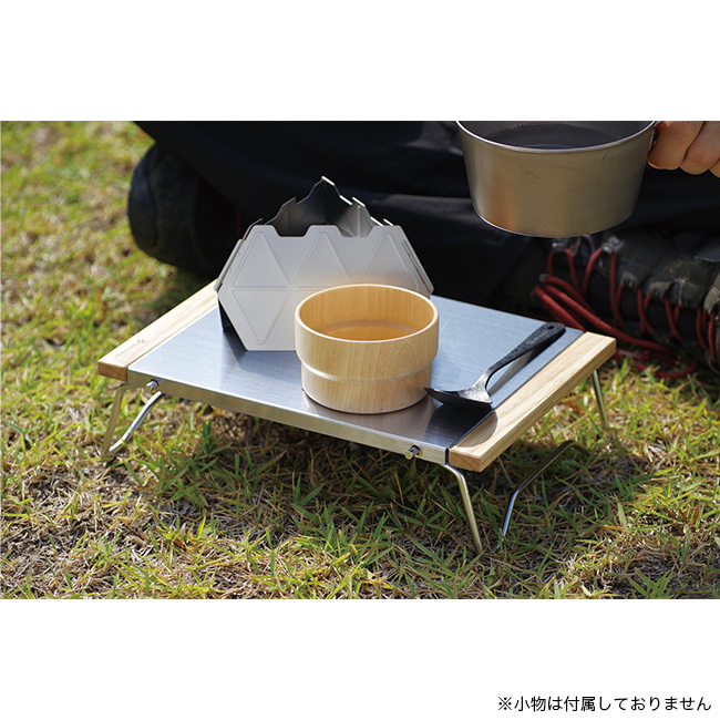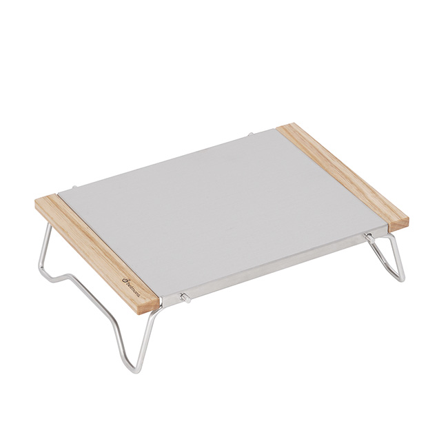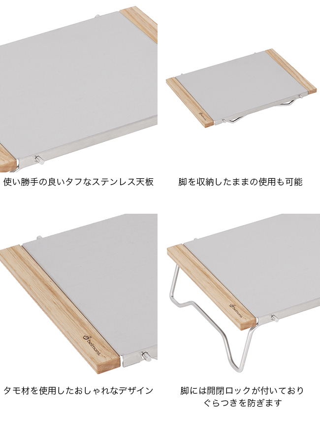 脚には開閉ロックが付いており、ぶらつきを防ぎます。使い勝手の良いタフなステンレス天板は、火の側で使ったりアルコールストーブなどを置いても大丈夫です。