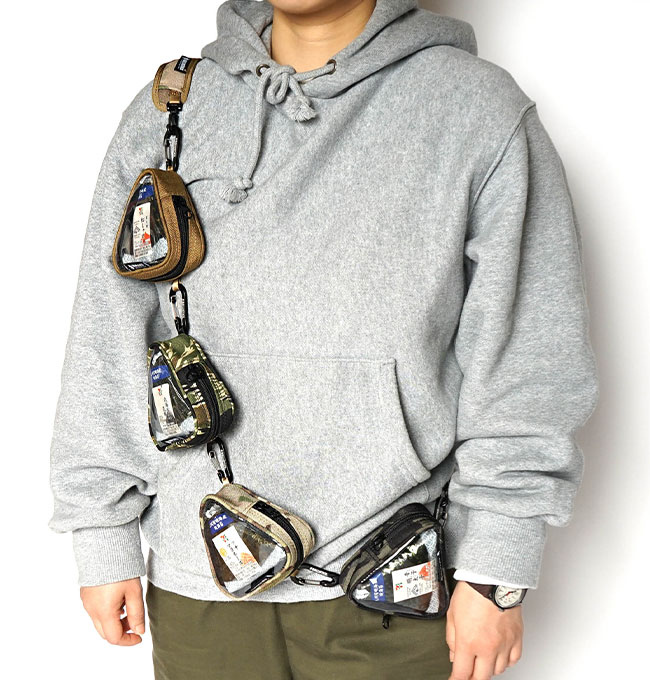 又、バックパックのショルダー部分によくあるウェビングに通してカラビナ等を併用いただきますと両肩にマウント出来ますので行動食入れにも最適です。