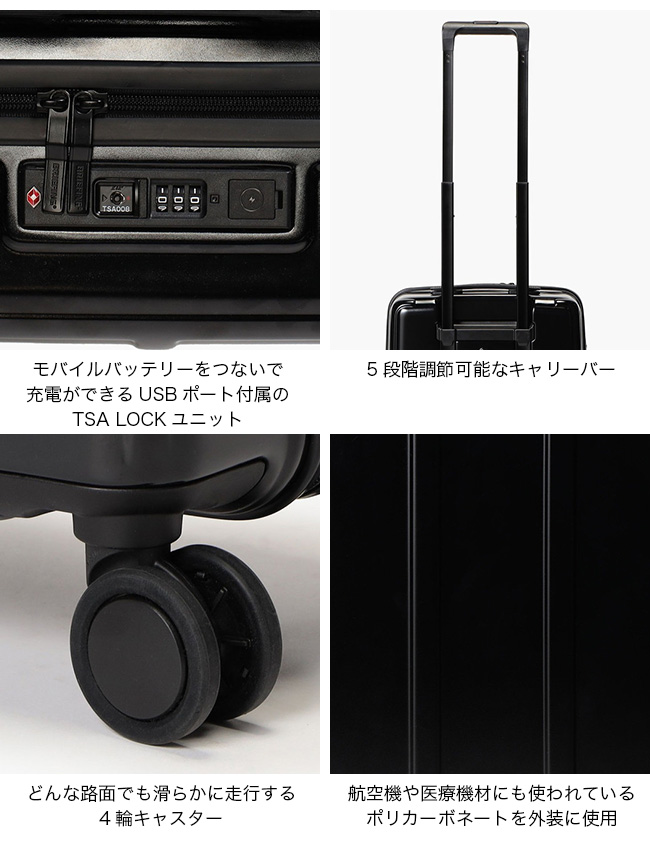 さらに、メインスペースとフロントポケットにはTSAロックを採用し、USBポート付きのロックパーツからモバイルバッテリーに接続してスマホなどの充電が可能です(※PC充電は非対応)。