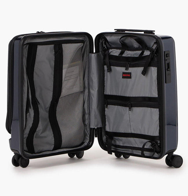 中面には収納アイテムの視認性に優れるメッシュポケットのほか、滞在先のホテルウォールポケットとして使用できる仕切り板を搭載。