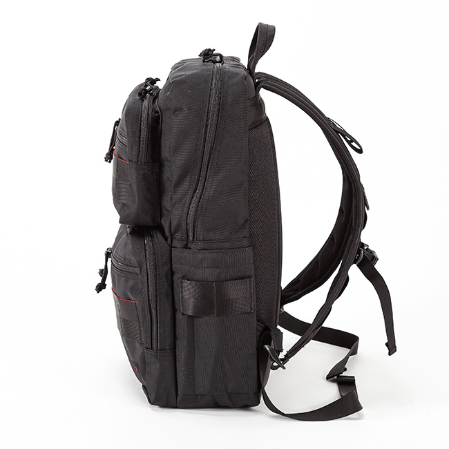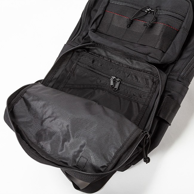 メイン収納部は約13Lとコンパクトなつくりでありながらも、フロントにマチを設けたポケットを2つ配置することで、見た目以上の収納力を確保。