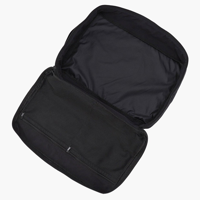 内部はシンプルな構造で仕切りをなくし、蓋部分にはメッシュポケットを配置。